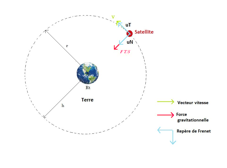 L’accélération a d’un objet est formée de deux composantes : une accélération tangentielle aT et une accélération normale à la trajectoire aN. Elles s’expriment ici dans le repère de Frenet défini par 2 vecteurs unitaires uT et uN (voir image) avec pour origine le centre du satellite : c’est donc un repère en mouvement.